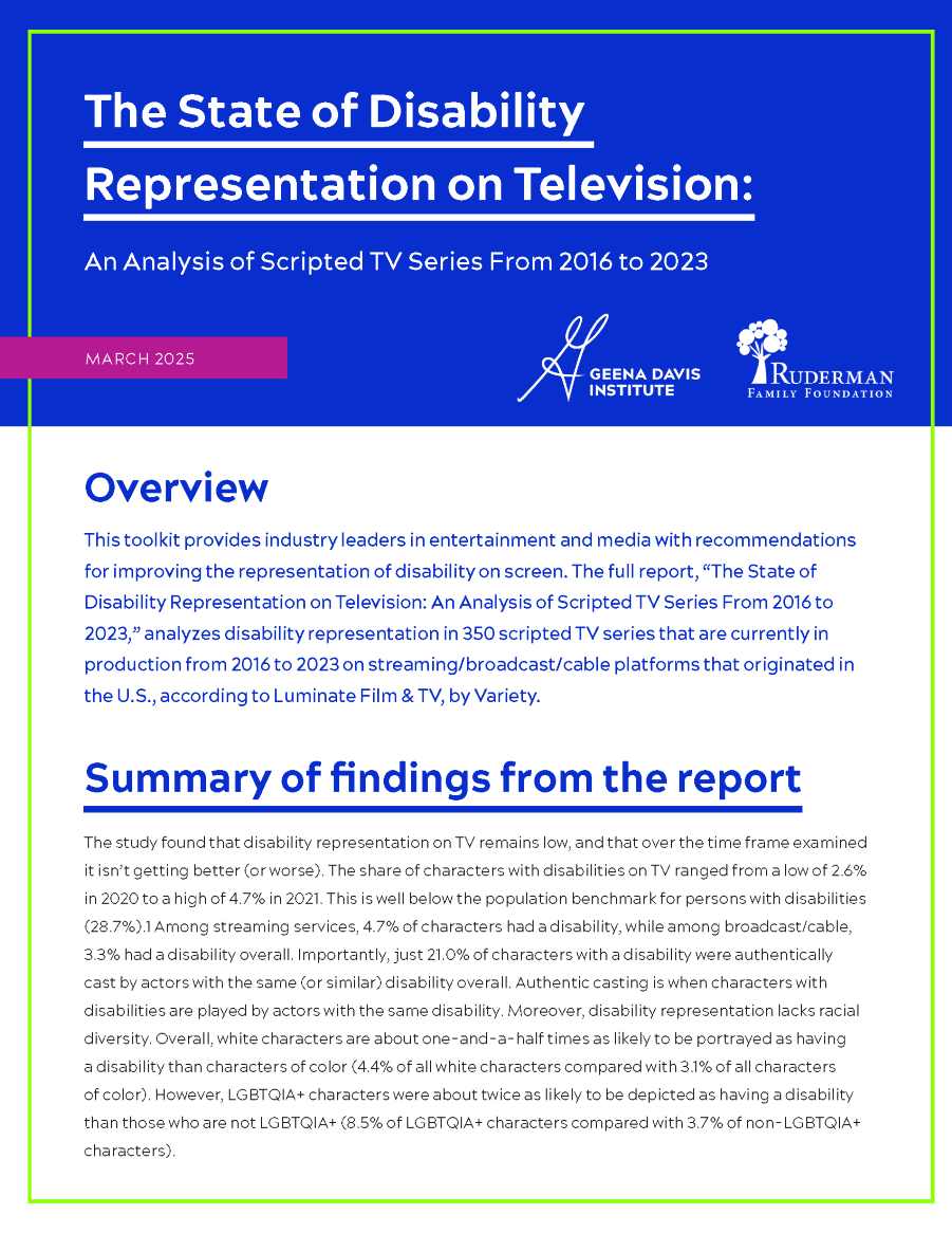 This toolkit provides industry leaders in entertainment and media with recommendations for improving the representation of disability on screen. The full report, “The State of Disability Representation on Television: An Analysis of Scripted TV Series From 2016 to 2023,” analyzes disability representation in 350 scripted TV series that are currently in production from 2016 to 2023 on streaming/broadcast/cable platforms that originated in the U.S., according to Luminate Film & TV, by Variety.